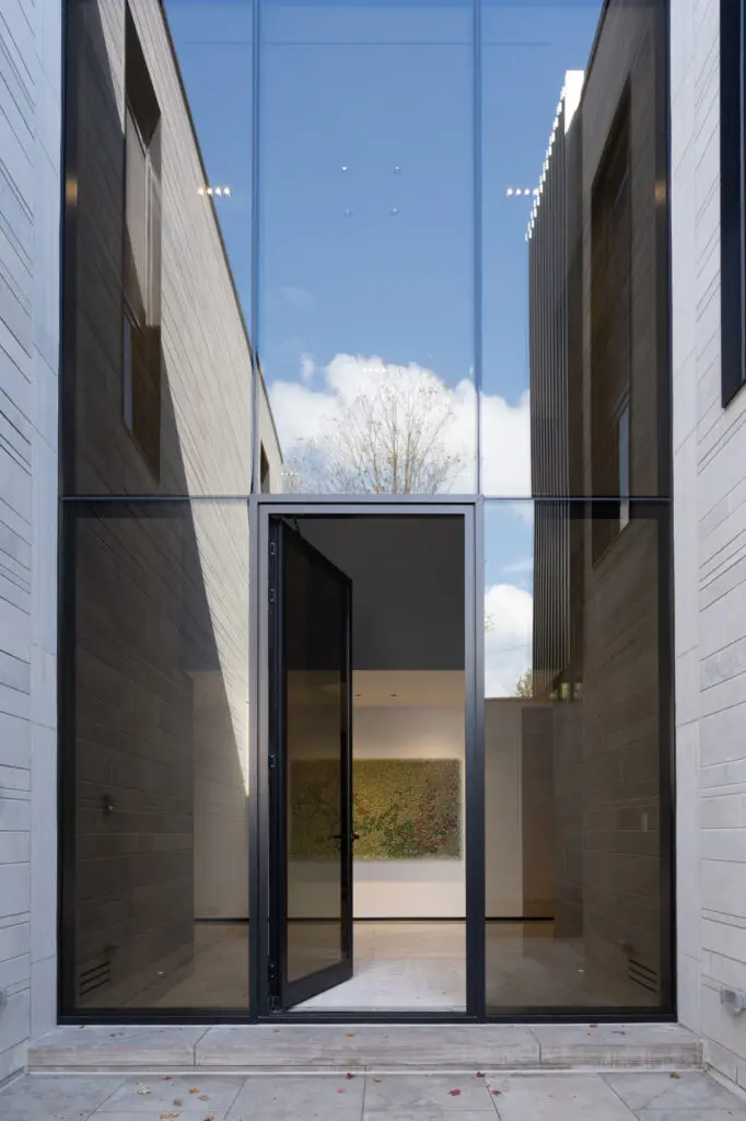 The entry itself is marked by a large glass wall and door—transparent, welcoming, and intentional—drawing visitors into the first architectural moment of the home