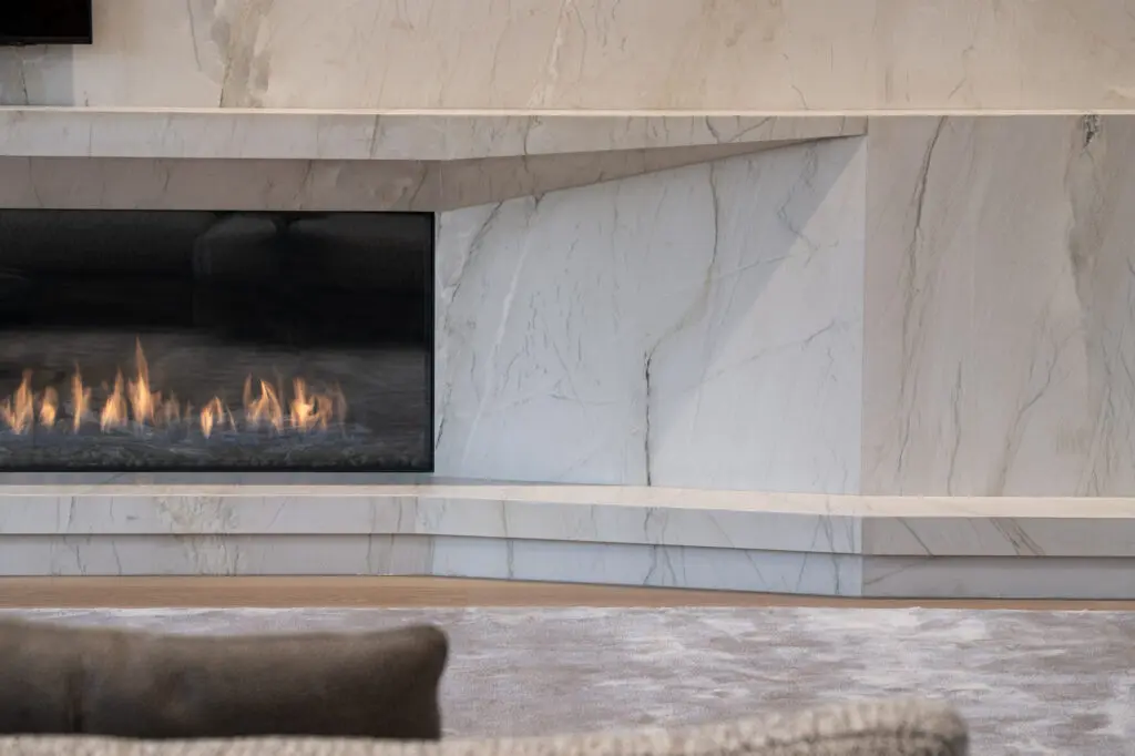 The living room anchors the main floor, spanning the full depth of the building. At its heart sits a custom-designed fireplace with a 12-foot fire opening, fully encapsulated in marble. The firebox is drawn low, emphasizing horizontality and reinforcing the relationship between warmth, view, and gathering.